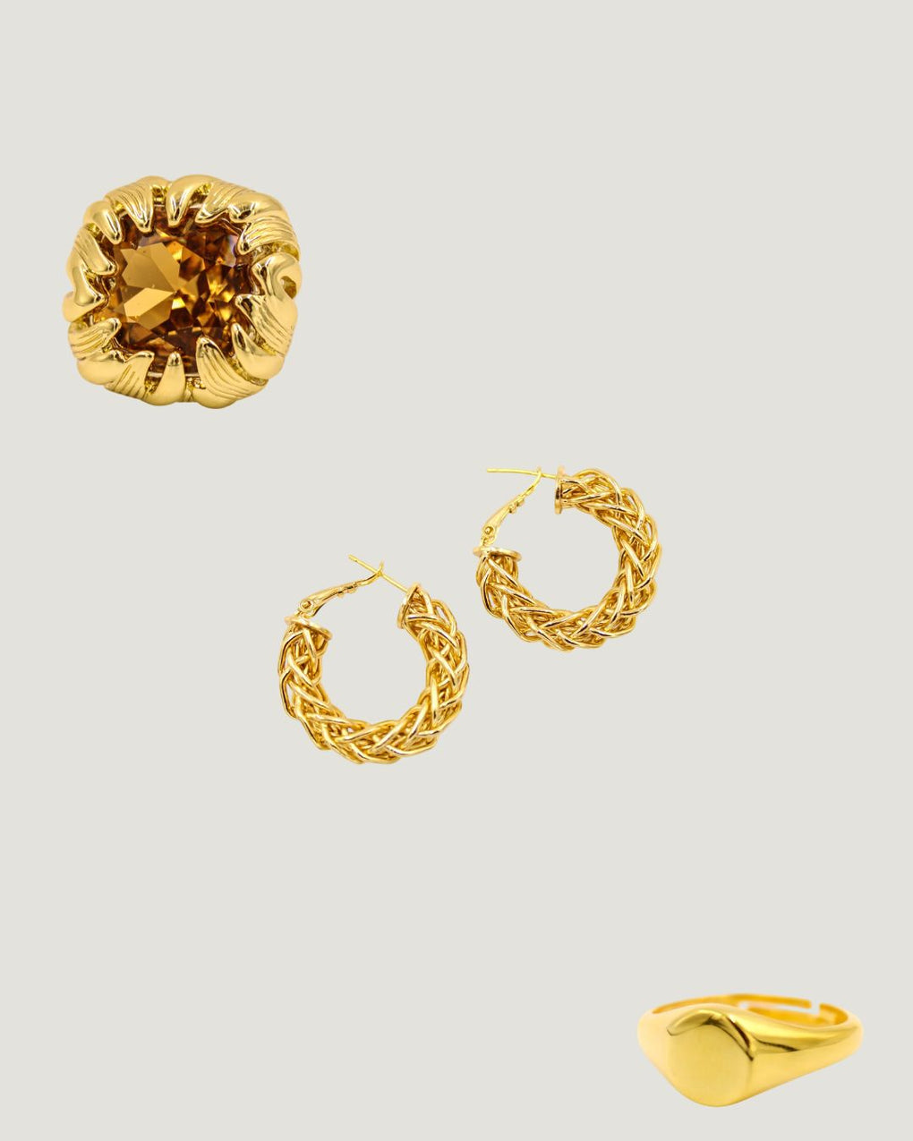 Kuvarsın en güçlü tonu, karakteristik bir stili ön plana çıkarırken serçe parmak yüzüğü kompozisyonu tamamlıyor. Kulaklarınızda zarif işçiliği ile ön plana çıkan geometrik desenler, göz alıcı ihtişamı tamamlıyor.
