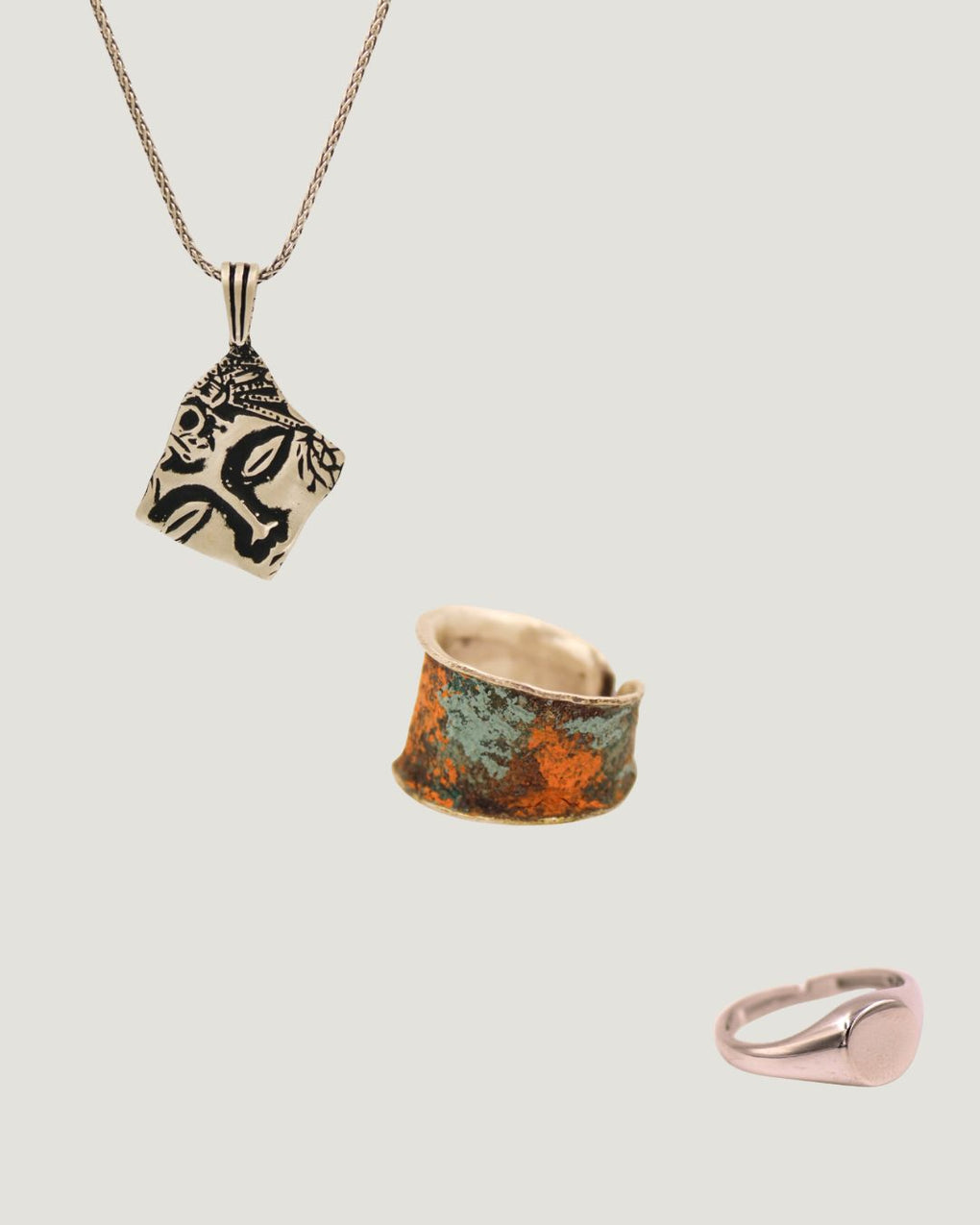 Otantik bir görünümün ikonik detayları, mine işçiliği ve serçe parmak yüzüğüyle.