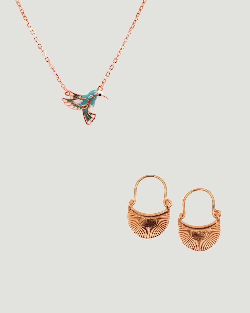 Rivayete göre "mutlu haberler" getiren mavi kuş, Ihlamur Kasrı küpelerle rose-gold minimalist seçimlerin vazgeçilmezi.